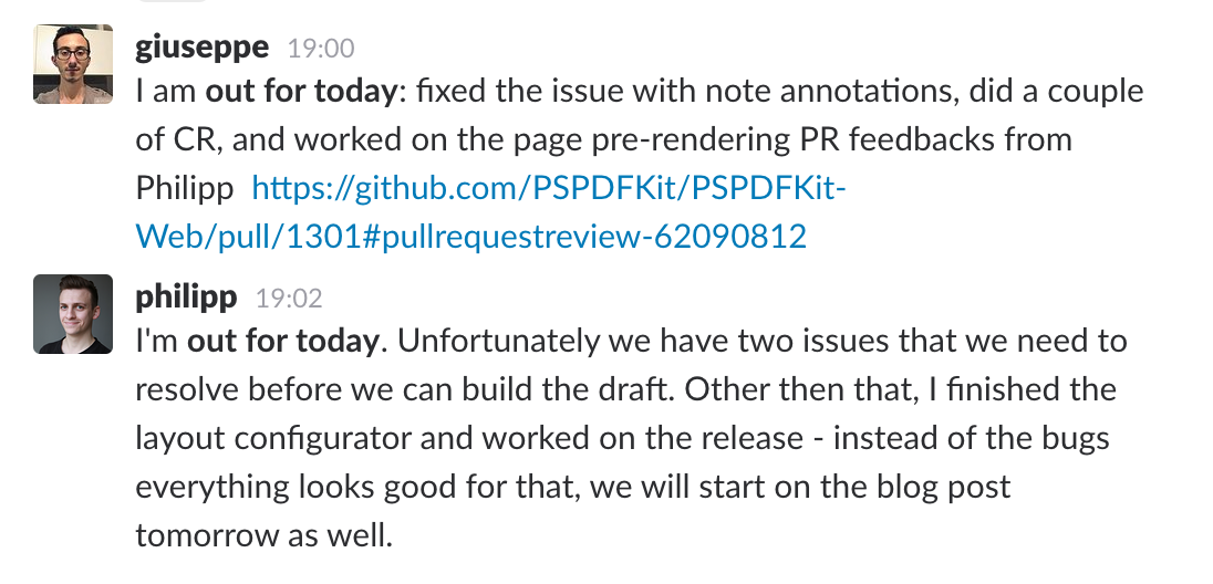 Communicating well is one of the key attributes of highly effective teams. We currently have 40 people at PSPDFKit, and because we’re spread across many countries and time zones, it’s a challenge to keep everyone in the loop. For a long time, we were small enough that email worked well. As we grew, we progressed to a single room in Campfire (now retired). But eventually we moved — like so many other companies — to Slack.