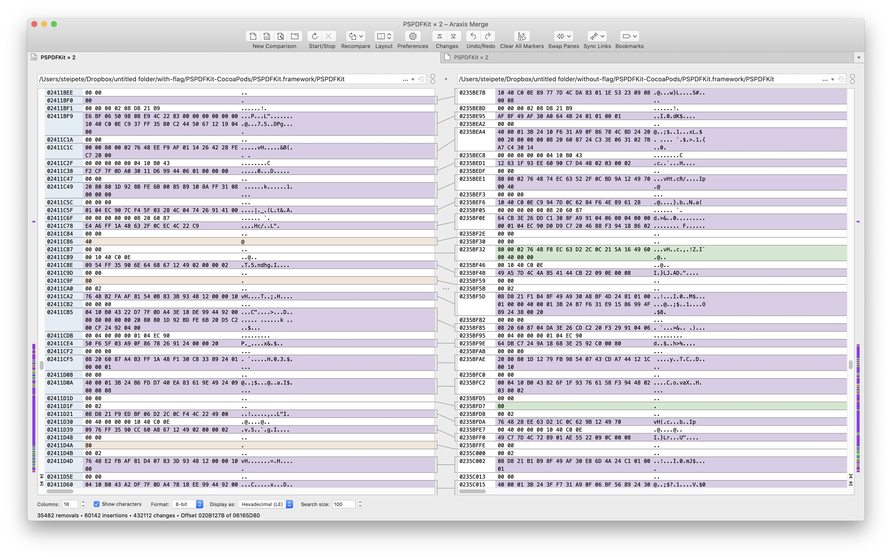 Then we looked where the strings containing steipete/Projects/lldb-debug-test (part of the folder where I compiled the binary) actually are. The -no-serialize-debugging-options flag promised these strings are not stored in the binary, and indeed, a PSPDFKit | strings check didn’t find anything.