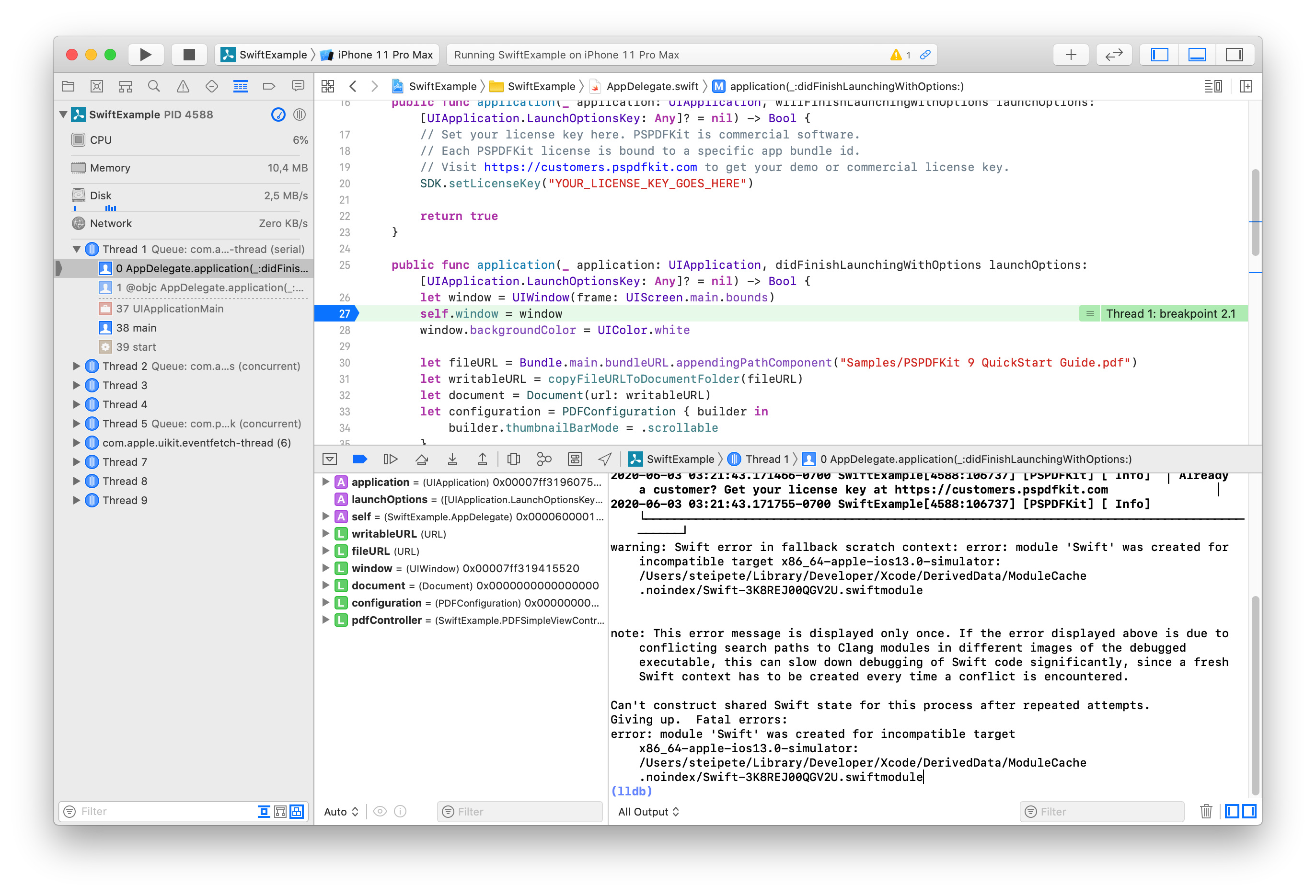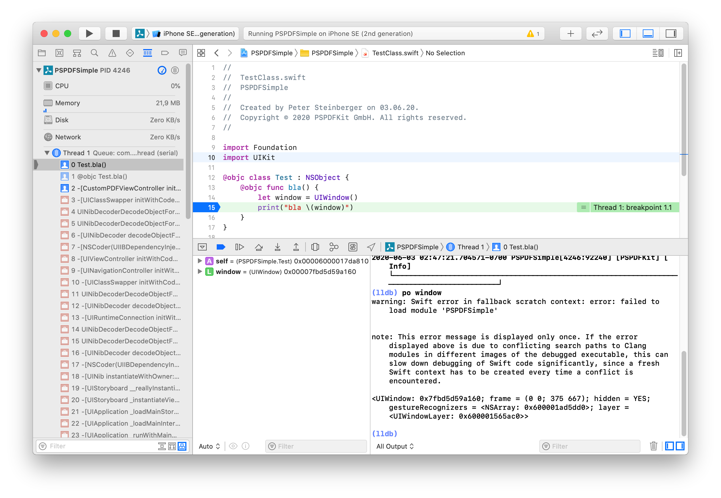 A few weeks ago, we started receiving support tickets with reports that people can’t use the lldb debugger anymore after integrating PSPDFKit. Instead of printing an object, they get Couldn't IRGen expression, no additional error. That’s obviously not great, and trying to understand what’s wrong here led me down a rabbit hole worth sharing.
