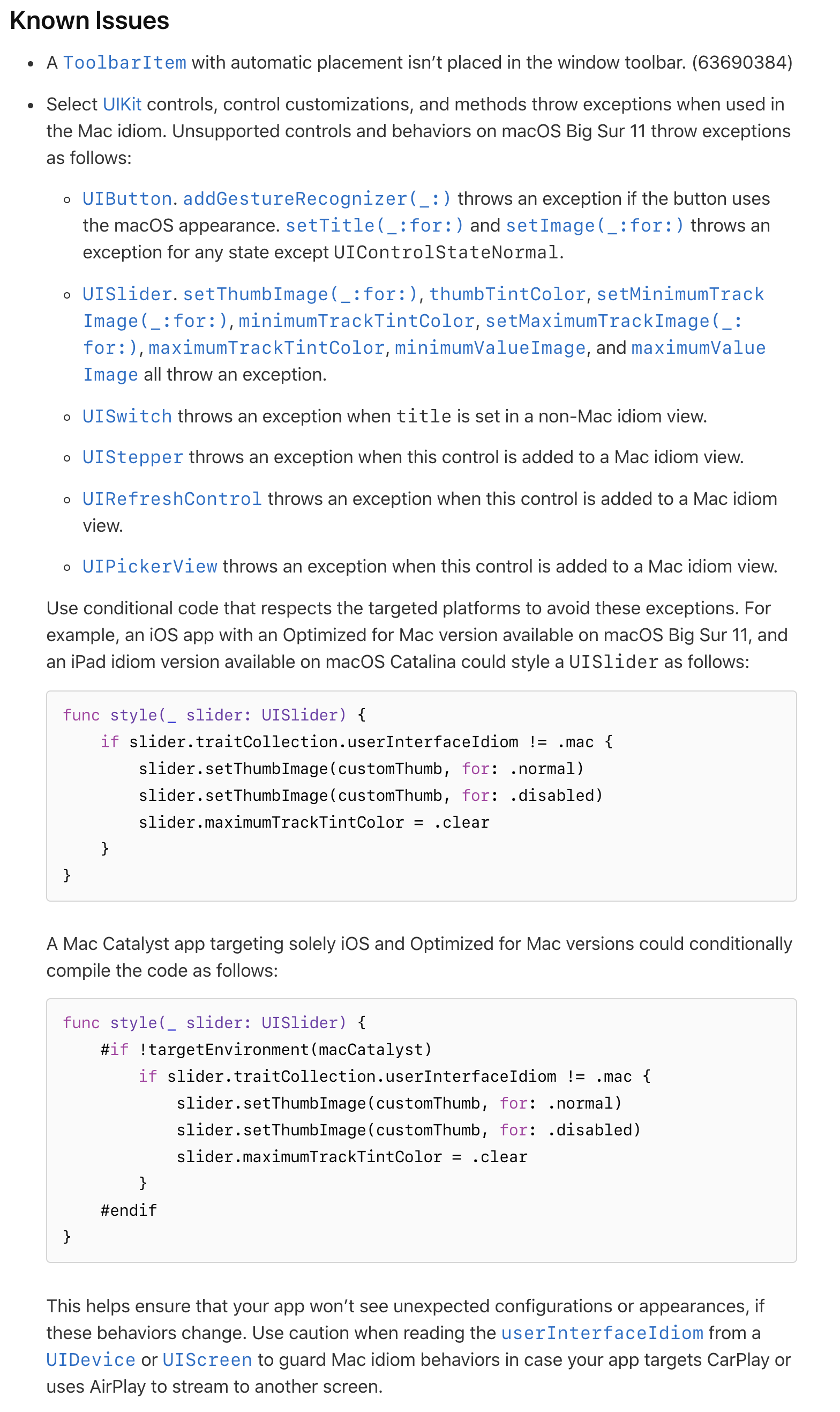 This is problematic, as it’s yet another restriction that isn’t documented. A better choice would’ve been to keep the UIKit variant in case customization exceeds what AppKit can do. It’s a surprising late change, and folks working on Catalyst apps are frustrated:
